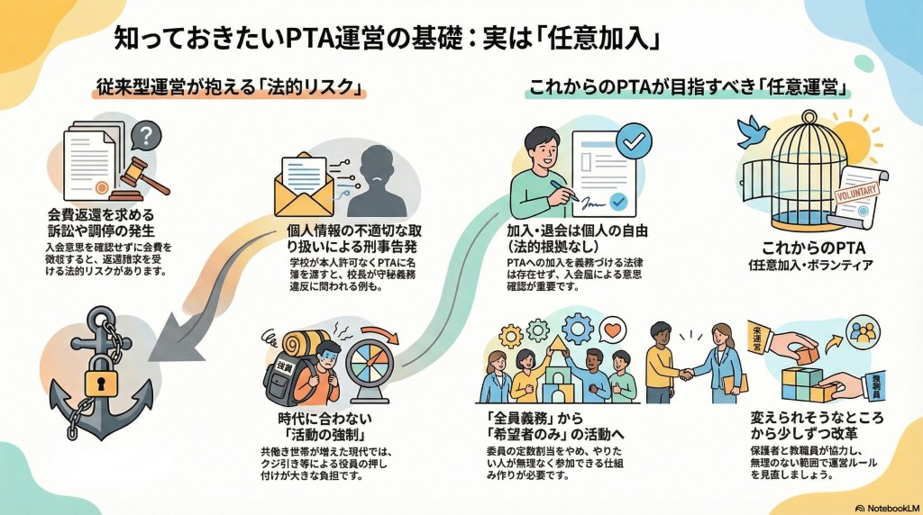 でもPTAって本来、入るのも活動するのも、じつは任意です。社会保険や弁護士会などと違い、加入を義務づける法的根拠は何もないのです。